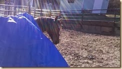 I like the idea of a tarp and borrow one of the offenders. Off we go to Royal’s pen and we spend the afternoon there. It has nothing to do with him crossing a tarp, wearing, dragging or playing tug of war with his buddy, Petri with one. It has everything in the world with gaining his respect, his trust, getting his mind settled and quiet.